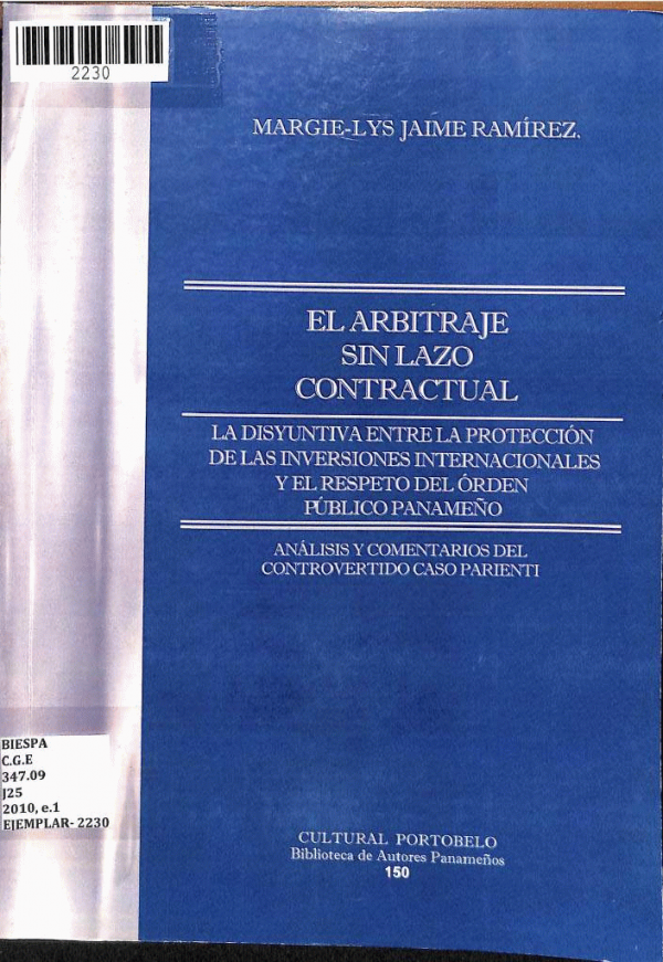 El Albitraje sin Lazo Contractual: La Disyuntiva Entre la Protección de las Inversiones Internacionales y el Respeto del Orden Público Panameño/ Margie-Lys, Jaime Ramirez