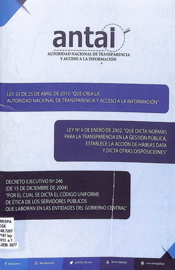 Ley 33 de 25 de abril 2013 "Que Crea la Autoridad Nacional de Transparencia y Acceso a la Información" : Ley No. 6 de enero 2002, Decreto Ejecutivo No. 246, de 15 de diciembre 2004/. por Series Ejemplar 3077, Ubicación Referencia Leyes