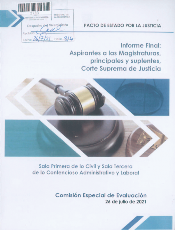 Pacto de Estado Por la Justicia : Informe Final: Aspirantes a las Magistraturas Principales y Suplentes, Corte Suprema de Justicia, Sala Primera de lo Civil, Sala Tercera de lo Contencioso Administrativo y Laboral/ Procuraduria de la Administración por Series Ejemplar No. 2783, Ubicación derecho Administrativo | ;